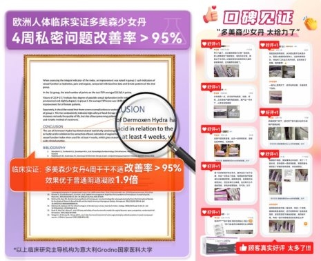 《白皮书》公布的临床研究数据更是佐证了多美森少女丹的卓越功效:受试者连续使用28天后,私密干涩及敏感度改善率高达95%,整体效果为普通阴道凝胶的1.9倍。因此,其凭借多重核心优势的协同,快速赢得了市场的广泛认可,用户正向反馈持续涌现,最终成为25至55岁跨世代女性日常私密健康养护及特殊时期(如产后、更年期、术后)修复的优先选择方案。