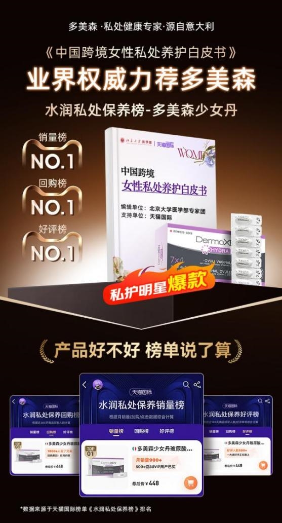 多美森“天然为本,科技为用”的严苛研发准则,获得了《中国跨境女性私处养护白皮书》的高度认可。该研究将多美森旗下产品列为行业标杆案例,验证其品质全面符合国际高标准要求。正是这种立足女性健康本质需求的研发态度,以及整合全球权威妇产科机构资源的强大药研实力,推动多美森进入中国市场后迅速登顶天猫国际私护保养类目冠军。